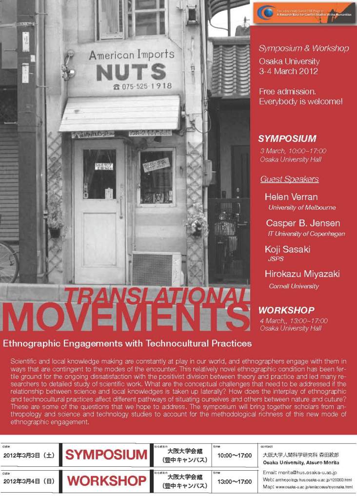 As a member of two parallel projects sponsored by the Japanese Society for the Promotion of Science (JSPS), a considerable part of my work has been revolving around the methodological issues of comparison and recursivity. Comparison has been a central tool of anthropological research, but it has lost a lot of its appeal since the 1980s. At the same time, comparing people, things, medications or cultures has rapidly become a part of everyday life, not at least due to technological and scientific innovation. We have organized a session at the 4S Meeting in Tokyo in 2010, and two international symposiums (Traveling Comparisons 2009, Translational Movements 2012) to tackle with such important trafficking between anthropological methods and technosocial realities. The results of these explorations have been published in two special issues of the same titles in the journals of East Asian Science, Technology and Society (see here) and NatureCulture (see here), respectively.